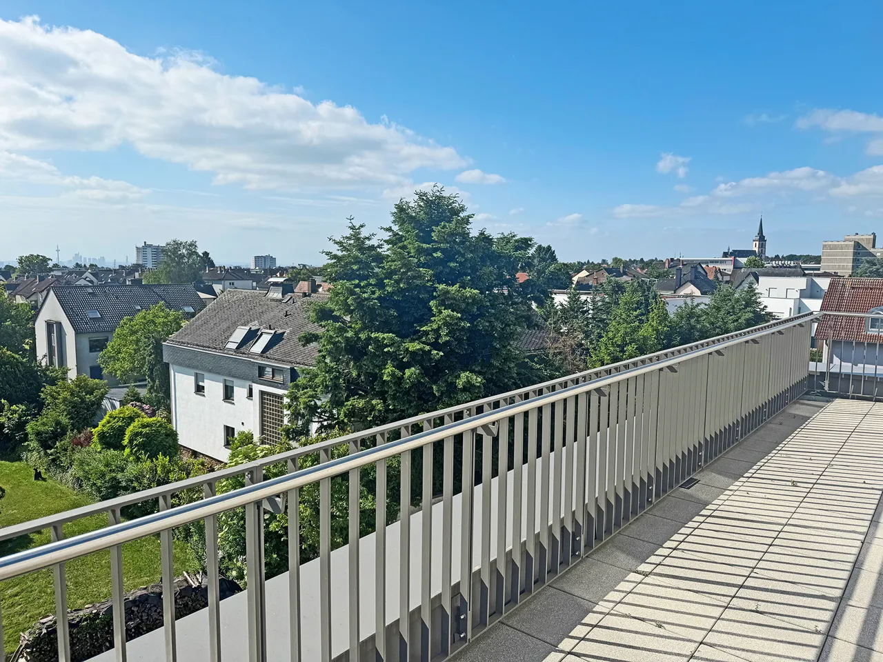 Das Schlafzimmer, das sich direkt neben der Ankleide und dem Hauptbad befindet, bietet nicht nur Ruhe und Rückzug, sondern auch den Zugang zur zweiten Dachterrasse – ein besonderer Rückzugsort mit Blick bis zur Frankfurter Skyline.