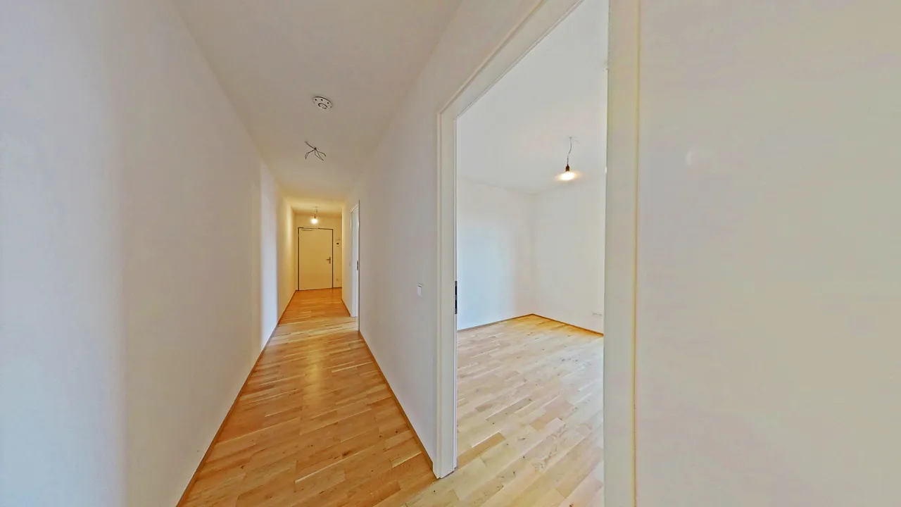 Die Wohnung verfügt außerdem über ein modernes Badezimmer mit bodengleicher Dusche und ein separates Gäste-WC, das zusätzlich Platz für Ihre Waschmaschine bietet.