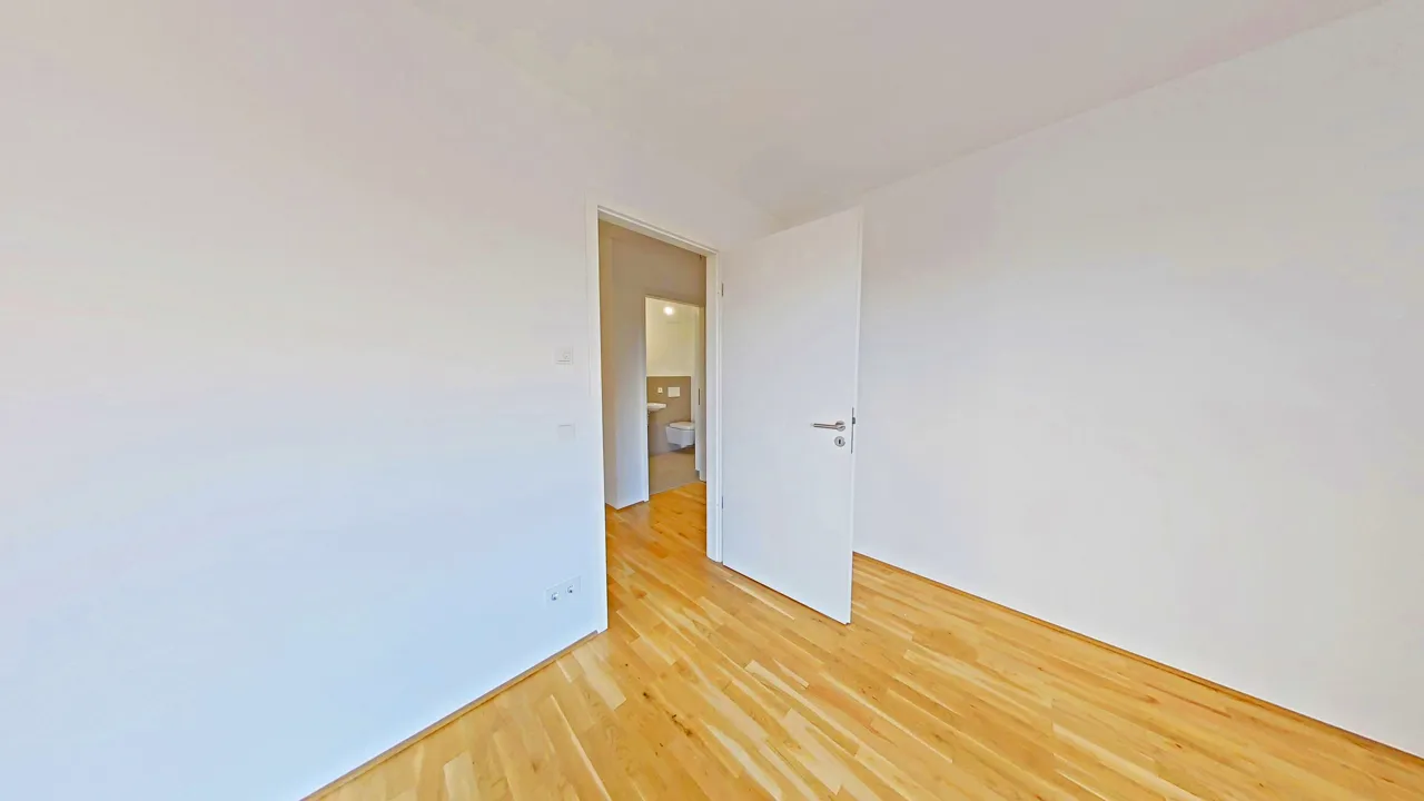 Das Schlafzimmer bildet eine ruhige Rückzugsoase, während zwei zusätzliche Zimmer flexibel als Kinder-, Gäste- oder Arbeitszimmer genutzt werden können.