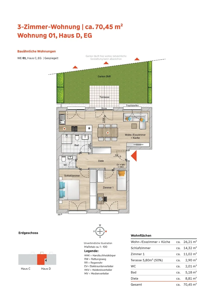 Entdecken Sie diese charmante Erdgeschosswohnung Nr. C01, die Ihnen modernen Komfort und eine durchdachte Raumaufteilung bietet. Mit drei hellen Zimmern, einem offenen Wohn-/Essbereich und einer angrenzenden Küche ist sie ideal für Familien und Paare. Genießen Sie entspannte Stunden auf der Terrasse oder im eigenen Garten – perfekt für gesellige Grillabende. Zusätzlich erwarten Sie ein modernes Badezimmer und ein separates WC.