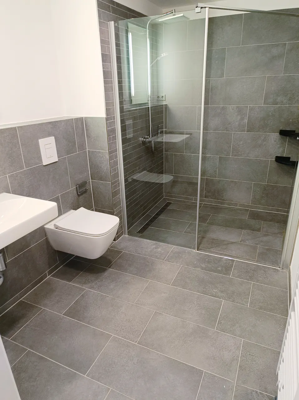• Elegantes Badezimmer: Bodengleiche Regendusche, großformatige Fliesen und Handtuchheizkörper.