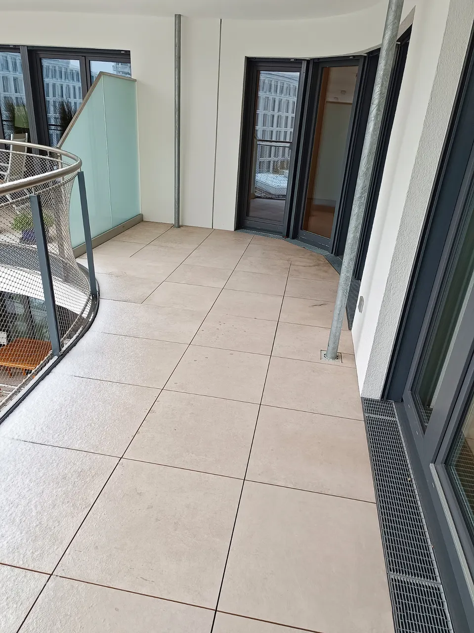 • Sonniger Balkon: Blick in den ruhigen, begrünten Innenhof.