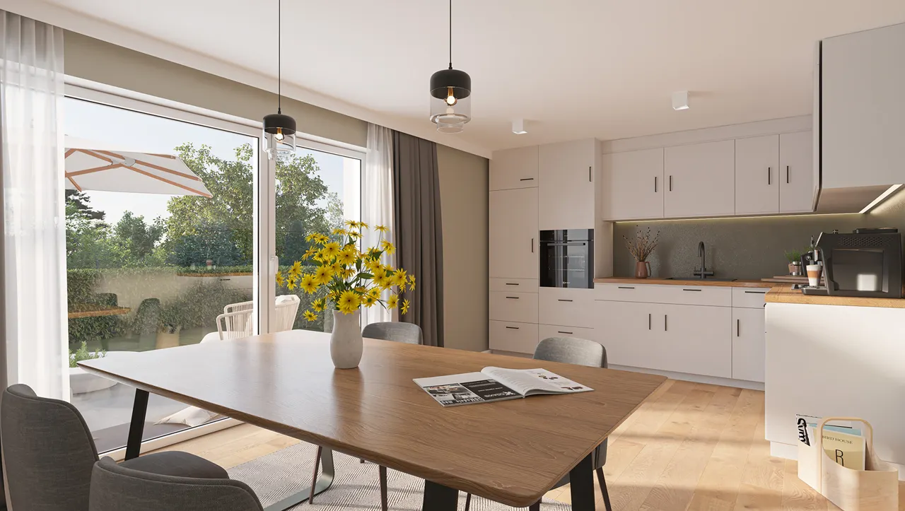Im Erdgeschoss entfaltet sich der Lebensmittelpunkt des Hauses: Die Küche mit Essbereich wird schnell zum zentralen Treffpunkt für Familie und Freunde. Von hier aus gelangen Sie direkt auf die Terrasse und in den Garten – ideal für gemeinsame Zeit im Freien.