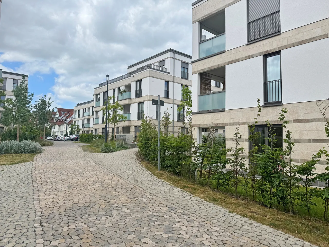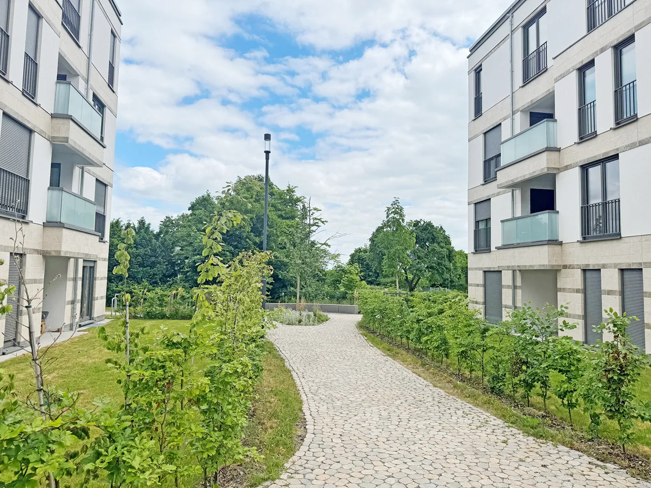 Alle Einheiten verfügen über eine hochwertige Ausstattung, Fußbodenheizung, Parkettboden und praktische elektrische Rollläden. Zudem gehören sowohl oberirdische als auch unterirdische KFZ-Stellplätze zum Angebot. Die acht Punkthäuser sind durch einen weitläufigen, grünen Innenhof miteinander verbunden, der als zentraler Treffpunkt und Erholungsraum für die Bewohner dient.
